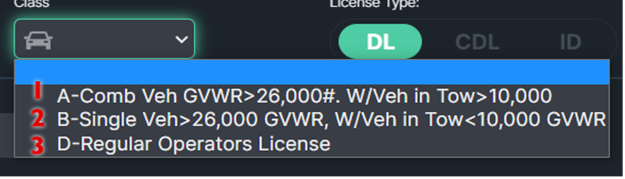 Class - this field indicates which types of vehicles you can drive. There are many different classes and they are different on each